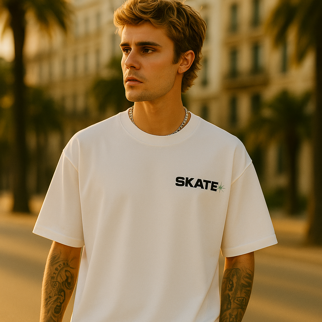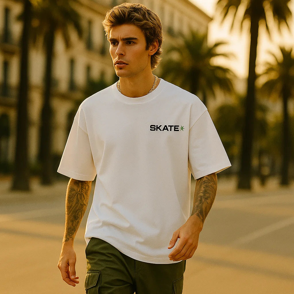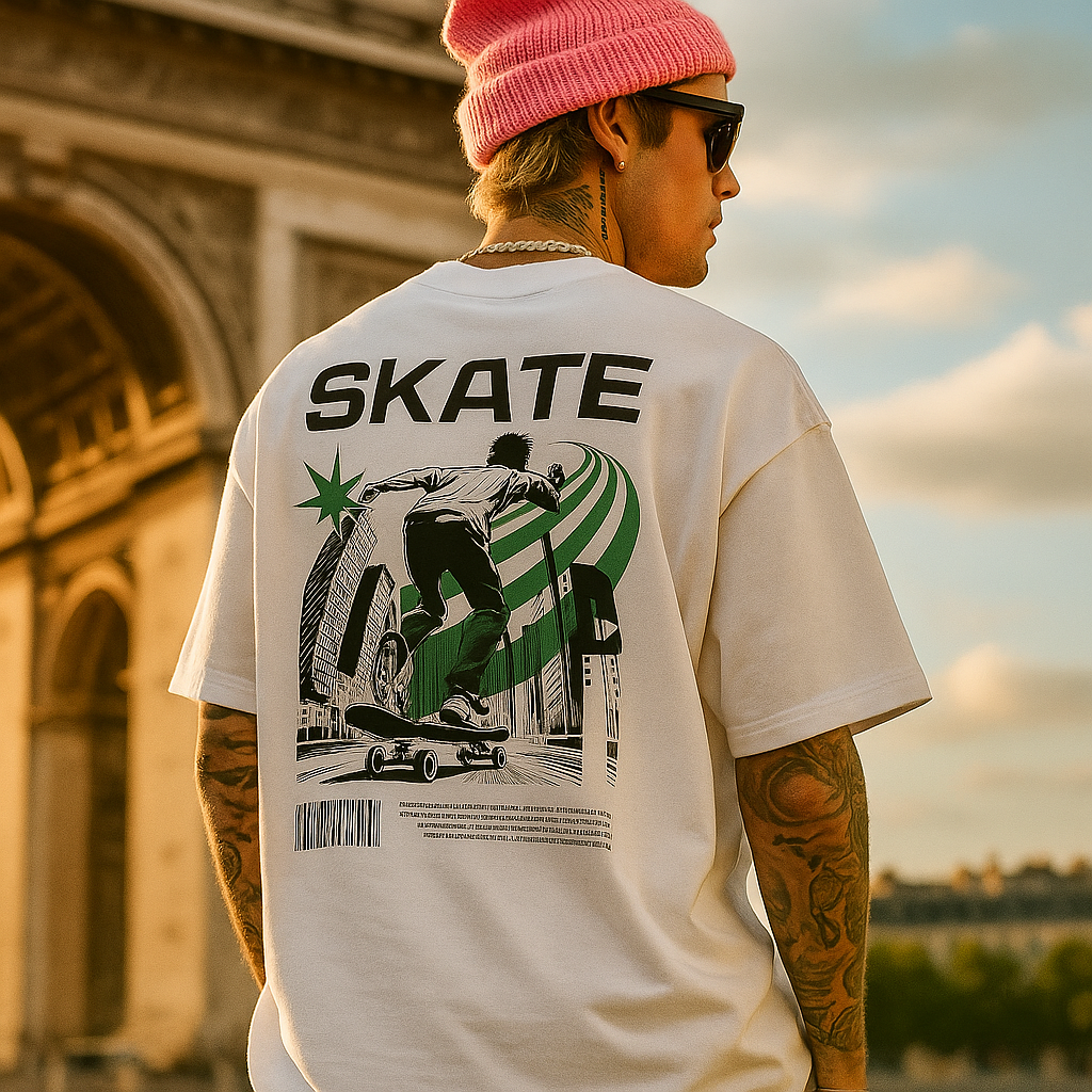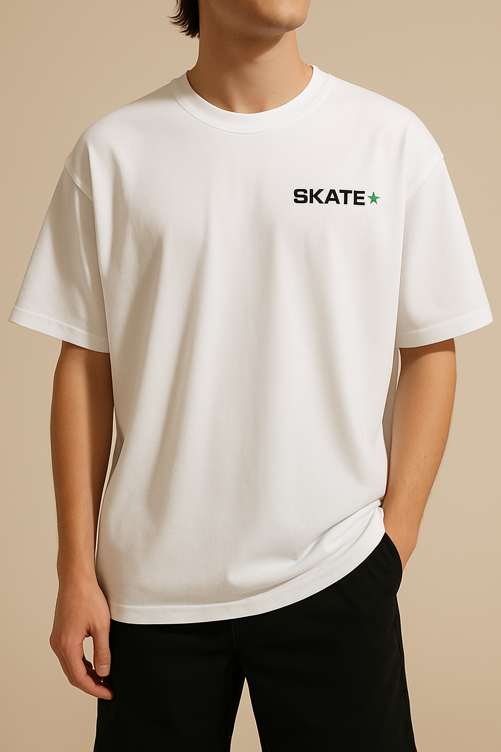 Ride bold with the Men’s White Oversized Skate Graphic T-Shirt, a heavyweight essential for skaters, creators, and rule-breakers. From its clean front logo to the high-impact cityscape graphic on the back — this tee is made for movement and street energy.