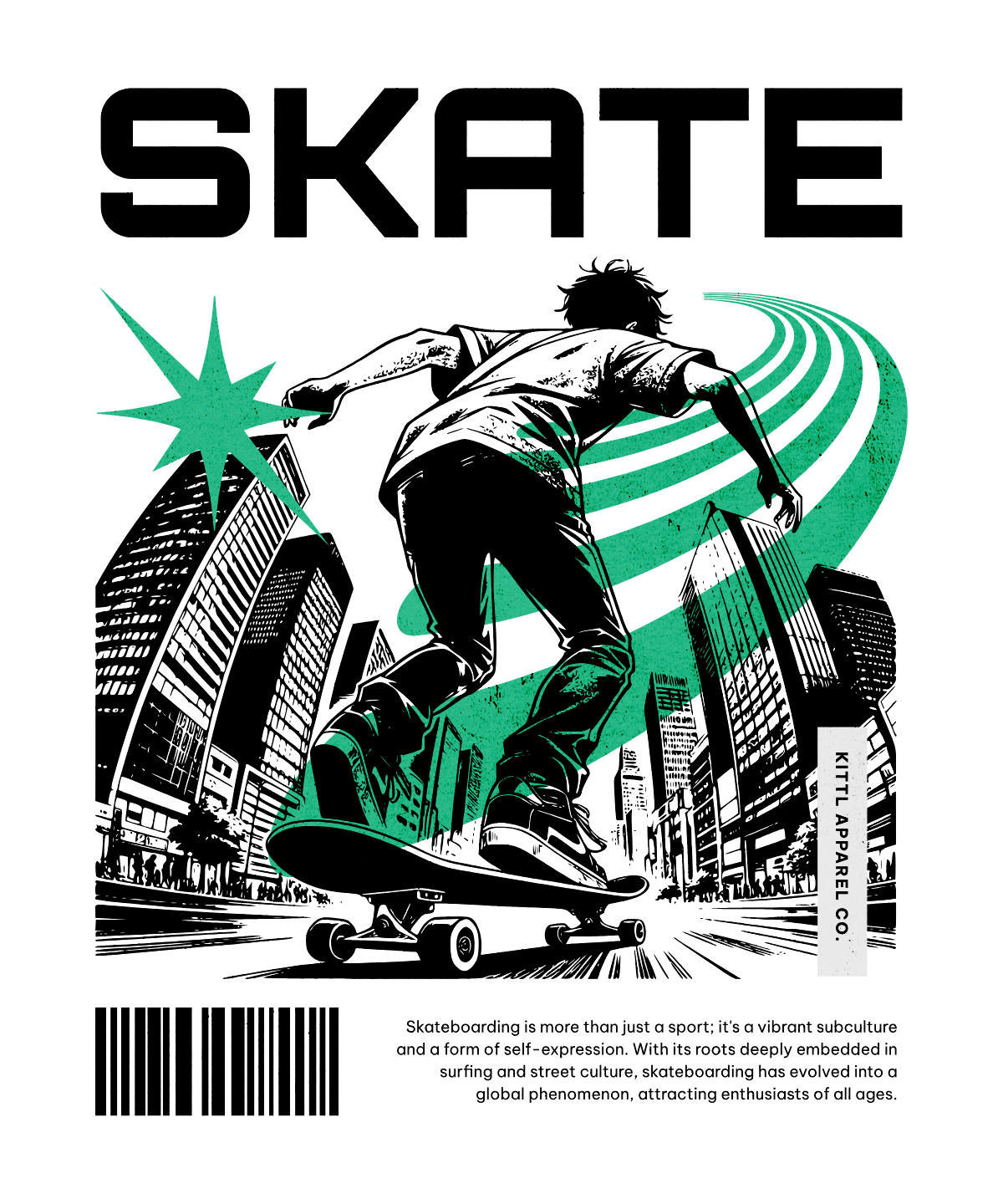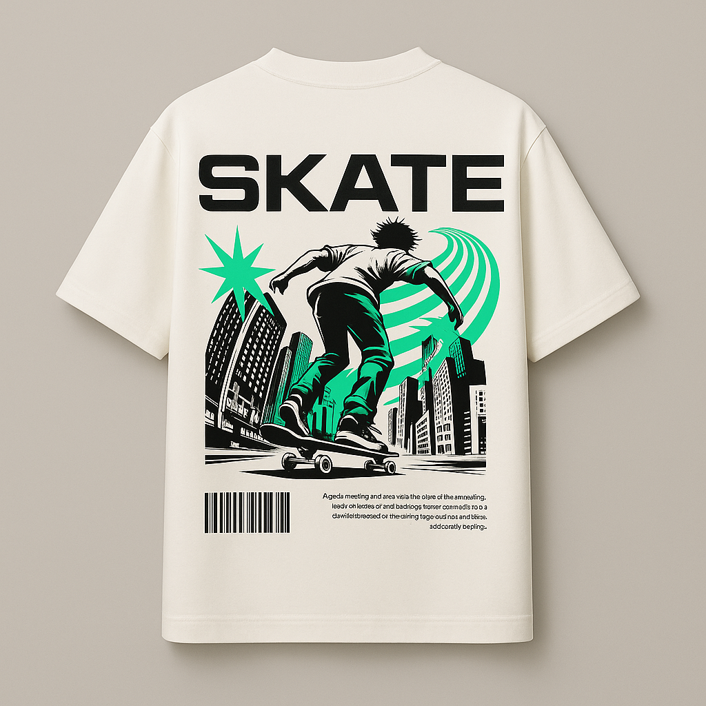 This tee captures the raw motion and independence of skateboarding culture. Featuring a dynamic back print with a city skyline and a skater mid-ride, it’s a visual tribute to rebellion, rhythm, and freedom.